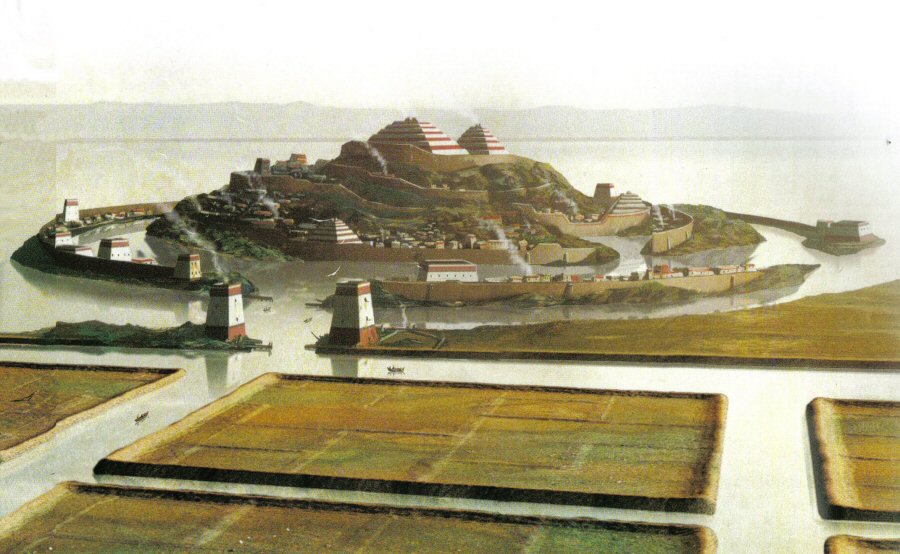 The city, also named Poseida,as was the state, was composed of a series of oncentric walls and encircled by flowing seagreen canals. It was full of beautifully constructed Temples,Universities, Theatres and Museums. At the very center was a hill, and on top of the hill the majestic and stunning Temple of Poseidon, which was visible from everywhere in the holy emerald city. Inside the temple was a massive gold statue of the God of the Sea showing him driving six winged horses made of extra terrestrial platinum.