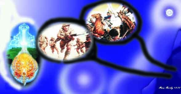 Extract from a later part on page 82 of the book where the education continues: The human speciesWe took our seats, and the "orientation and education" resumed. The pattern continued like that for the next 40 or so hours - the questions and answers, the long explanations the continuous stream of information that was fed to me in college classroom - type lectures and discourses. The sessions would last for four to six hours, punctuated by meal and bathroom breaks, at least for me. There was one other longer break in which I slept for eight hours, meaning that I had two full nights' sleep during my three days aboard. These would equate to Wednesday and Thursday nights at home.In the initial stages of the study of Earth, the human species was classified as borderline, one that quite possibly would have to be confined to its home planet. While the human animal was not considered anywhere near as vicious or ferocious as some of the worst species that the Verdants had come across, its warlike tendencies were cause for some concern. The human species, I was told, is the most diverse that the Verdants had ever encountered. Such diversityis a rarity in the universe of civilized beings, and although the Verdants have come to expect the unexpected, this came as a mild surprise to them. Until they discovered humans, they had never encountered a species in which there were wide character variations between individuals in the group. That is, a species might be good or evil, or any gradation in between, but never good and evil existing side by side in the same species. Additionally, each individual was a microcosm of the whole. picture principle of the two opposite poles that is fighting on earth just now: the"animaconsciousness" and"christ/angel/true HUMAN-consciousness" - feeded from the two similar spiritual poles in Earth's own spiritual/real consciousness.(not from book) "That meant that we could judge the character of an entire civilization by simply studying one individual," Tom said (another ET - person that educated him - and the name was some earthlike he was given for identification) . "If we found a moral individual, the species itself, as well as all other individuals, was moral. Where we came across barbarians, the species invariably turned out to be barbaric." "However, discovery of human beings - and the infinite variations in character that constitute the species - threw a monkey wrench into that formula. "Never before had we seen cruel and remorseless individuals exist side by side with kind and compassionate ones within the same species," Tom said. "Destructive and murderous people walk among the caring ones on Earth. Tyrannical governments rule over peaceful and gentle people, while immoral people exist under benevolent governments. This phenomenon - this range of diversity among humans - is absolutely fascinating." They came to understand that humans not only vary from individual to individual, but also between individuals and the group as a whole. It took some time for the Verdants to make these distinctions. another picture showing the fight on Earth between REAL love and SELFISHNESS. a=higher worlds that bring spiritual help and inspiration. b=the fightingzone c=the negative pole in earths consciousness. d= we - the earth's braincells are in the middle of the test and fight/election. e=cells for the negative /dark pole of earth. g= ufos bringing inspiration and direct help from other pfysical worlds.(not from book) "Your long history of warfare - which we have personally observed - told us that we were looking at a savage (primitiv) race," Tom continued. "On the group level we witnessed international conflict, corruption, thievery, the rape of the environment, the plunder of natural resources, and the unspeakable cruelty of genocide. On an individual level, we observed mendacity, thievery, murder, child abuse, hypocrisy (hykleri), sadism, and cowardice of epidemic proportions." All of these things spoke of a depraved (fordervet) species, Tom explained. But closer scrutiny (granskning) revealed individual accomplishments (talenter) in the arts, music, literature, and architecture that demonstrated a surprising nobility of spirit and mind. It was these redeeming qualities that caused the Verdants to change their minds about us. Humankind's status was upgraded to "acceptable' after the Verdant scientists had enough data to confidently predict that the species could safely be welcomed into the intergalactic community - with certain reservations. So, it wouldn't be a stretch to say that humankind will find its place in the heavens thanks to the refined, intelligent, gentle, cultured people who walk among us. It was their contributions that caught the Verdants' attention and convinced them that the species was worth nurturing. This nurturing of the human species presented a unique challenge, they said - one that they had never faced before. Typically, when helping to prepare other species to make the transition from planet-bound animal to star traveler, the Verdants simply shared their technology with the entire civilized species. But that formula won't work because of humankind's unrivaled (uforlignlige) diversity. The goal, in this case, is to preserve the redeeming qualities in the species while ensuring that the darker elements of the human character - personified by the dangerous rogues (kjeltringer) of society - are isolated. In other words, to resort to a platitude, they wouldn't throw the baby out with the bathwater. That is, the better nature of humankind, represented by the gentle people, the artists, the thinkers, the lovers, the dreamers, the scholars, the builders, the hundreds of millions of moral people who live ordinary lives of decency, would be welcomed into the intergalactic federation. But there would be no place in the cosmos for the wicked and immoral - those who by their very words and deeds on Earth have demonstrated that they are not fit candidates for members