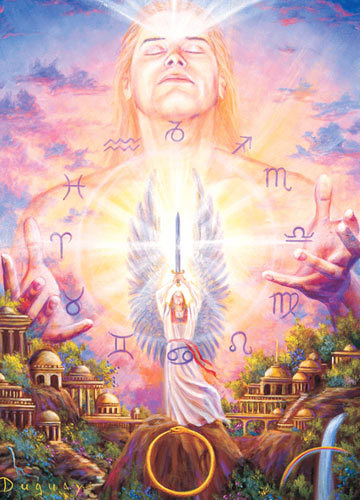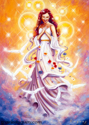 Jeg så min elskede stå i sitt værelse med hendene strakt ut mot meg for å dra meg til seg. To sterkt strålende ånder sto på hver sin side av henne; omkring henne var det en ring av flammende sølvlys som en mur som omgav henne.
