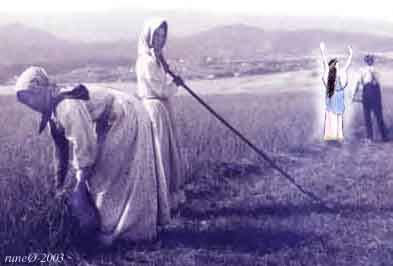 Minnena från denna avlägsna tid har så förbleknat, att jag inte kan avläsa dem annat än i stora drag. Men en episod har ristat sig in i min hågkomst. Det var då min fostersyster kom och sökte upp mig. Jag var sysselsatt ute på fältet med att rensa bort ogräs. Trött av att krypa på alla fyra, reste jag mig och sträckte på ryggen. Då fick jag se en kvinnlig varelse komma emot mig, men hon var inte lik de kvinnor, som bodde i vår sfär, hon var ljusare och vackrare, och hön nästan svävade fram över den oländiga mark, där vi andra gick med tunga steg. Först kände jag inte igen henne, men när hon sträckte båda armarna mot mig och sade: "Grane, vad jag är glad att äntligen få träffa dig!" då förstod jag, att det var Magnhild.