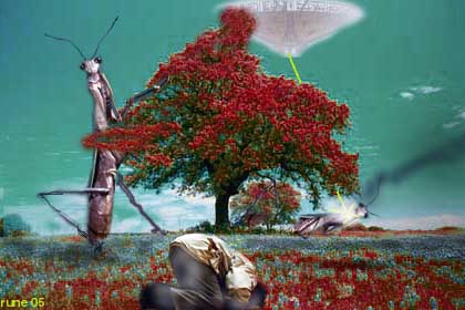 atomkrigen skapte mutasjoner av før ufarlige insekter slik at noen disse ble kjempestore - slik som denne "praying mantis" -  og en voldsom trussel for de få overlevende mennesker og overvåkerne var igjen aktive med å utslette disse slik bildet forteller
